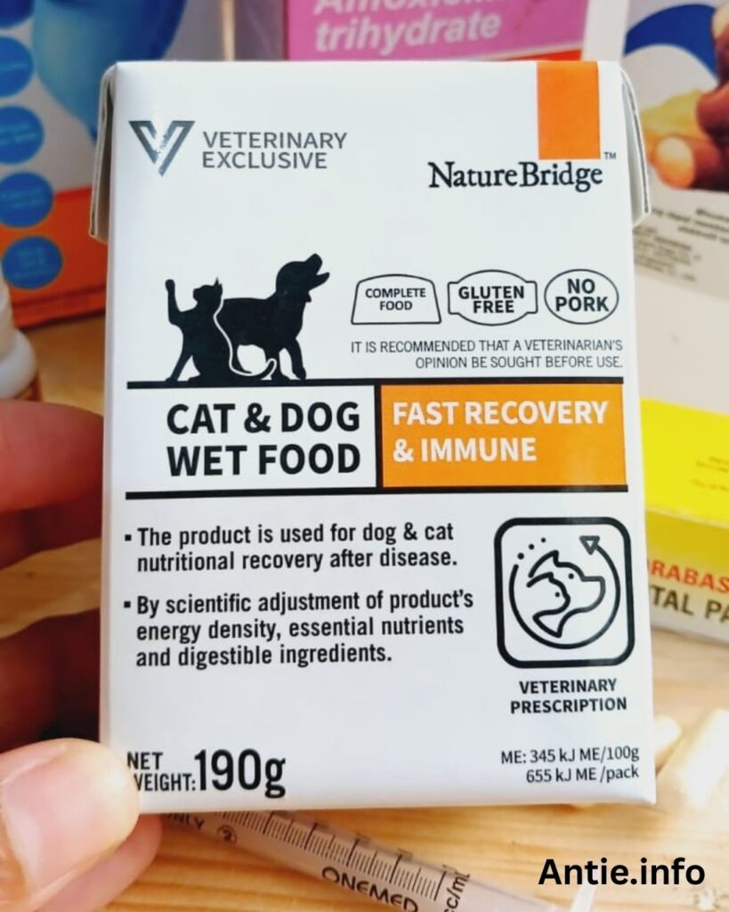 - Wet Food (Nature Bridge Recovery): Berikan 1 sendok teh yang dicampur sedikit Pedialyte agar teksturnya lebih encer. Berikan sedikit tapi sering. Setelah kemasan dibuka, tutup rapat dan masukan ke kulkas.