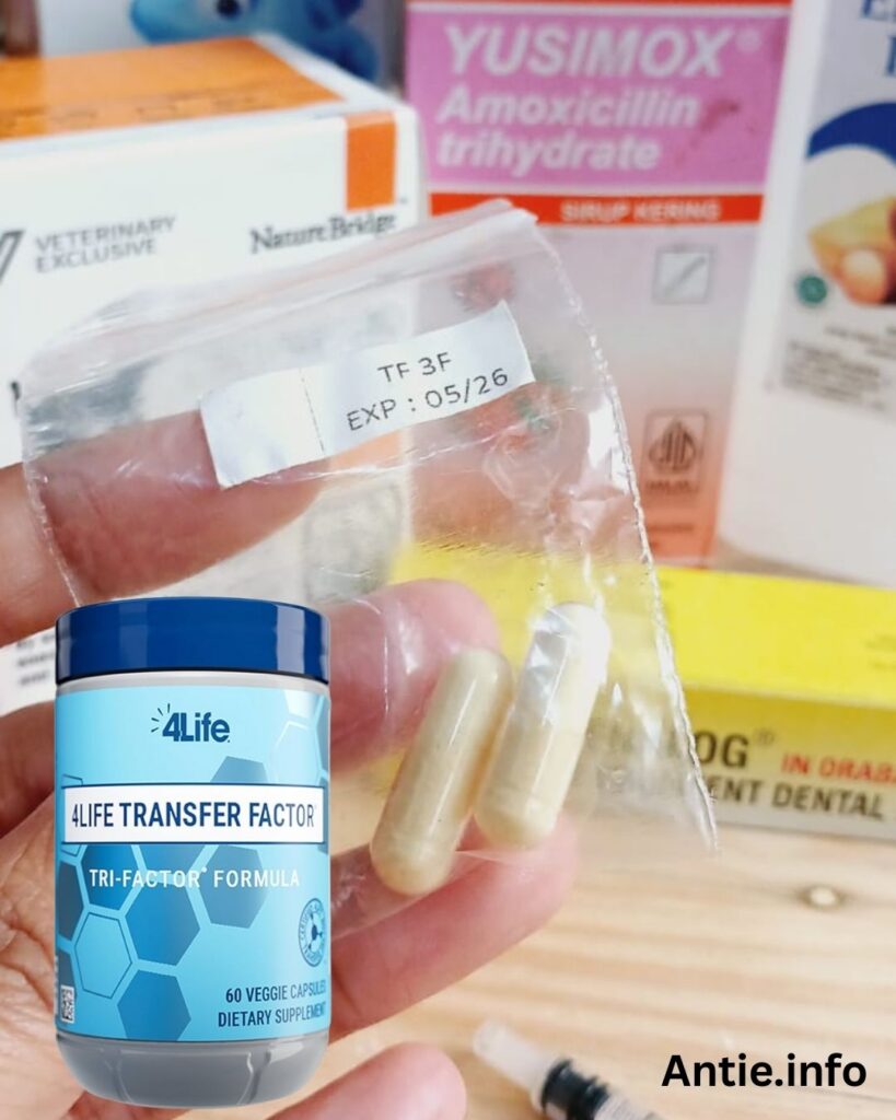 - Transfer Factor TRI: Berikan 1 tablet setiap pagi dan sore setelah makan. Bisa dicampurkan ke makanan atau dilarutkan dalam air.